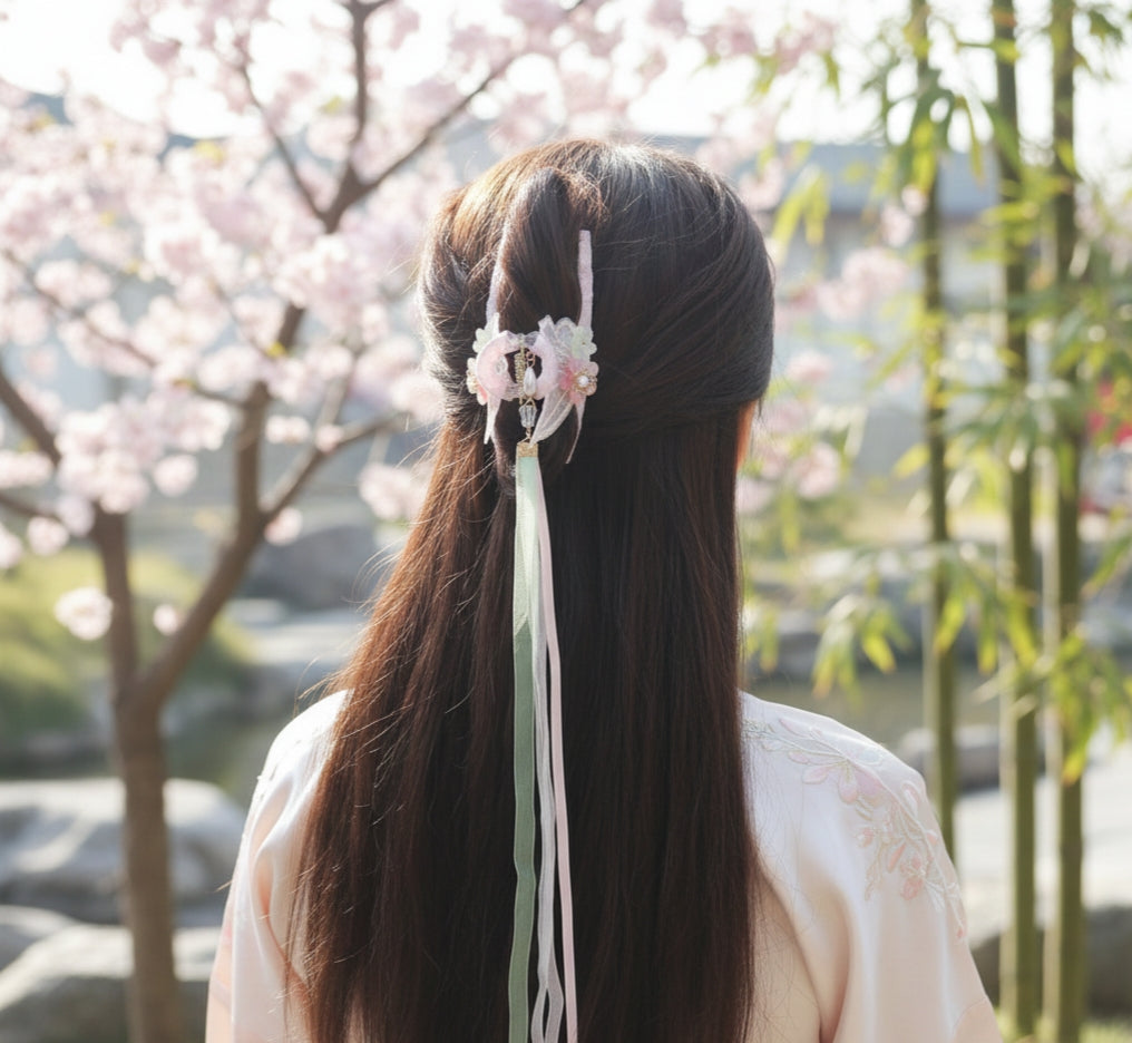Handmade Fairy Blossom Hair Claw Clip with Long Tassel Ribbons – Elegant Hanfu Hair Accessory for Women and Girls – Pink Floral Butterfly Design with 42cm Streaming Tassels